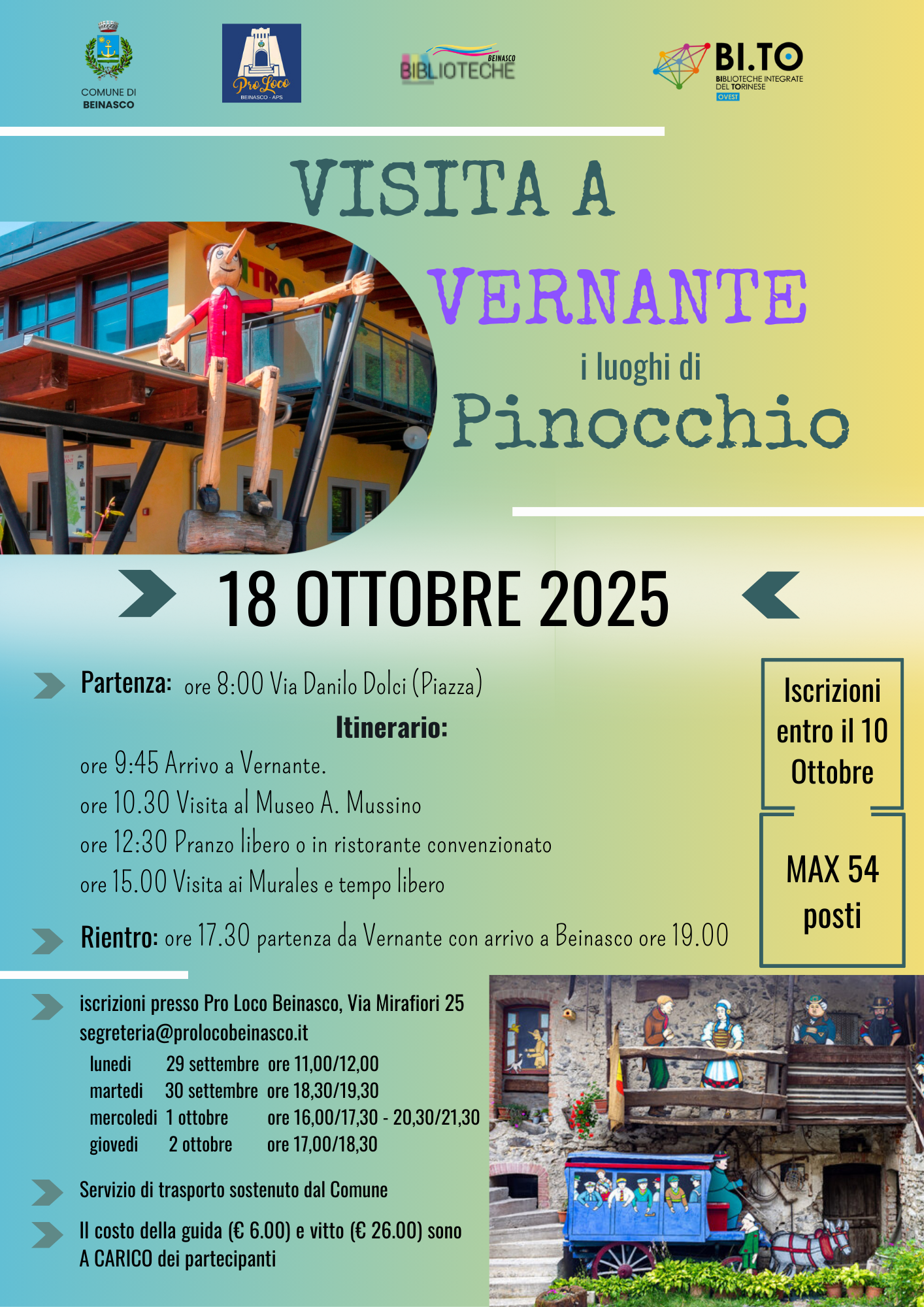 Il progetto nasce con l’obiettivo di offrire ai cittadini di Beinasco un’esperienza culturale e ricreativa alla scoperta di Vernante, il borgo delle Alpi Marittime noto per i suoi murales dedicati a Pinocchio.