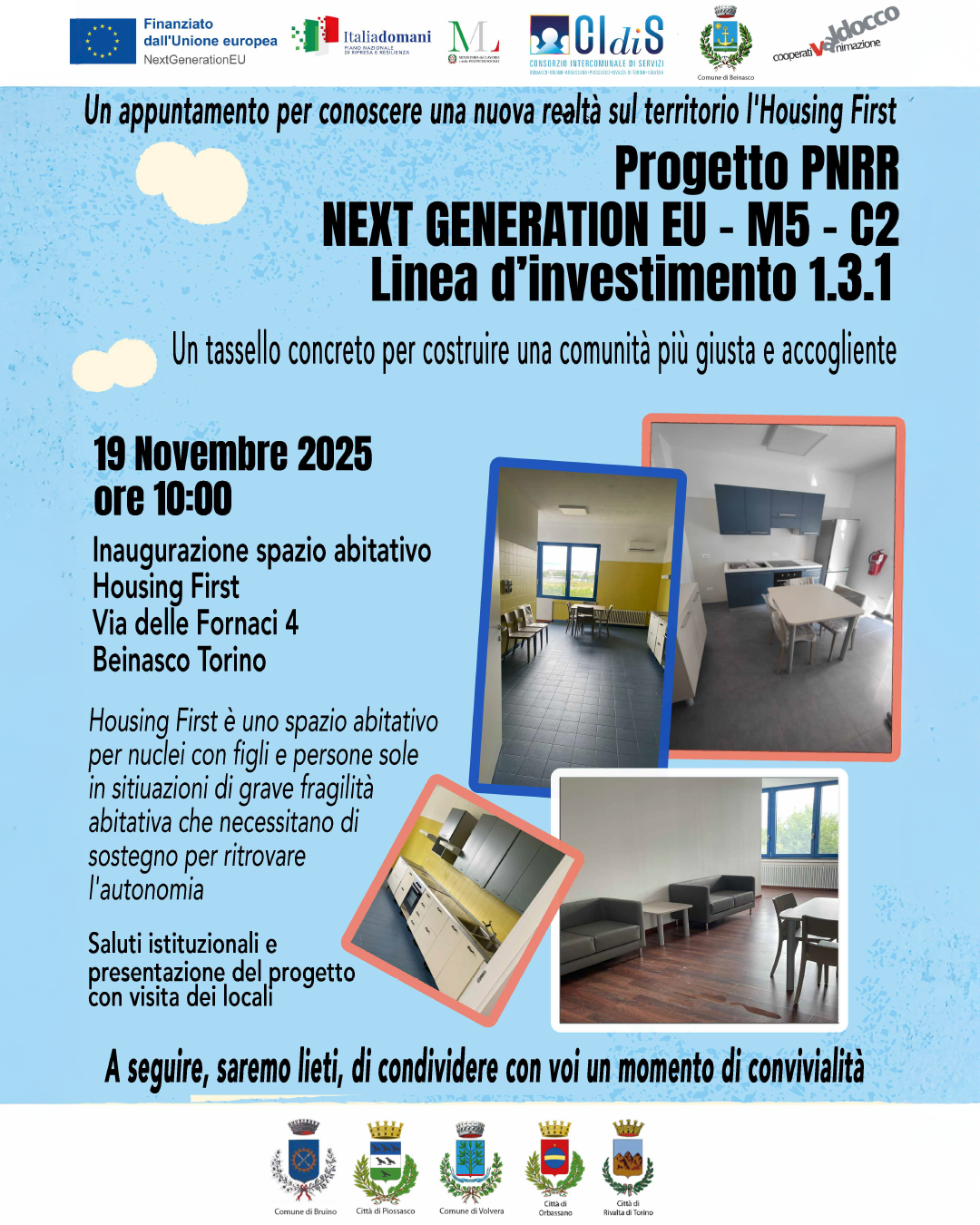 L'inaugurazione dello spazio abitativo "Housing First", realizzato dal CIdiS in collaborazione con il Comune di Beinasco e in coprogettazione con la Coop. Valdocco, è fissata per il 19 novembre 2025 alle ore 10:00 presso Via delle Fornaci 4, Beinasco (TO)