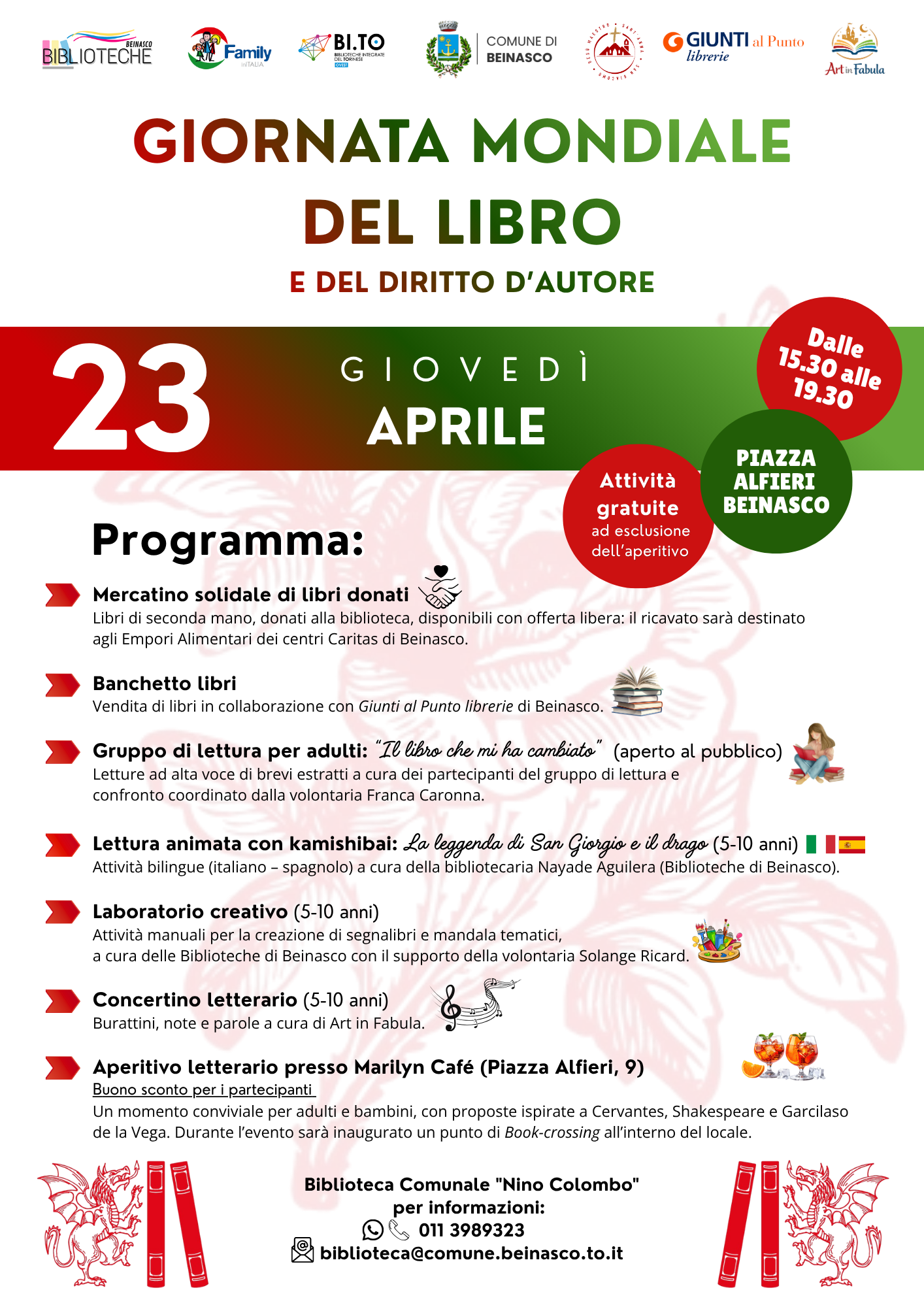 Giornata Mondiale del Libro e del Diritto d'Autore 📚 Si tratta di un evento celebrativo che si terrà giovedì 23 aprile 2026 in Piazza Alfieri a Beinasco, dalle 15:30 alle 19:30.