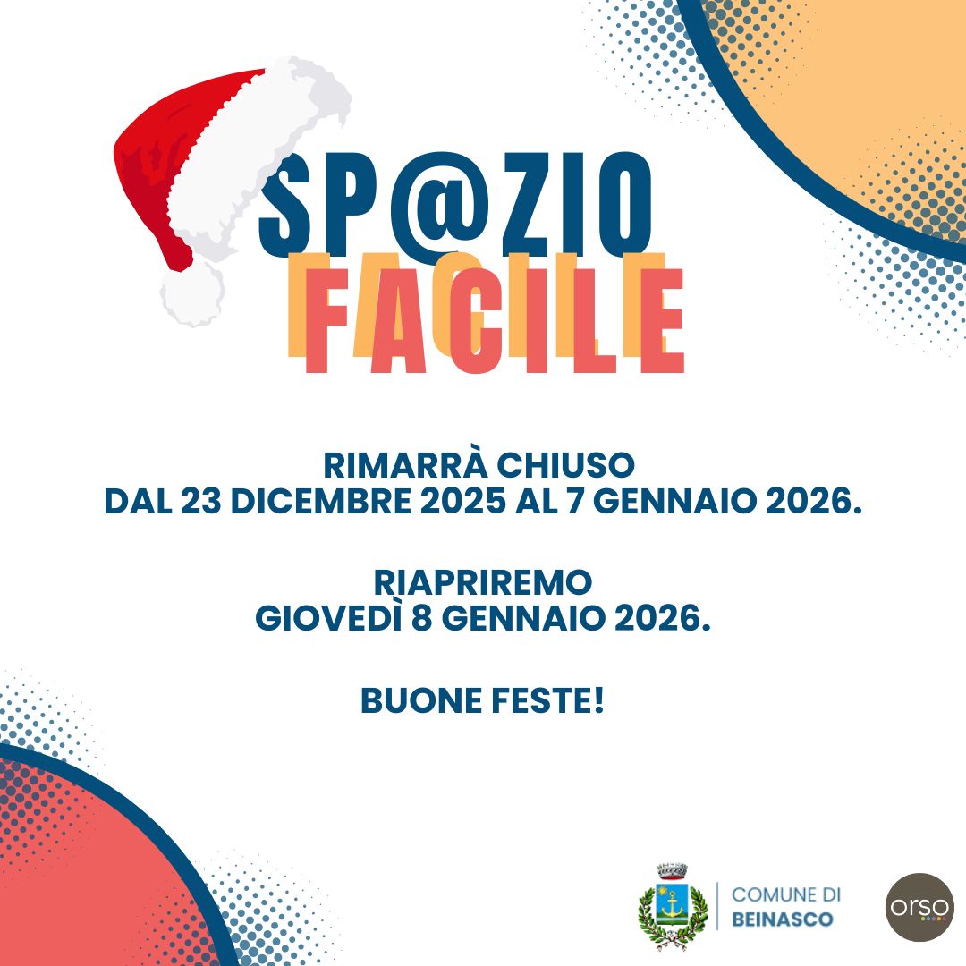 In occasione delle festività natalizie e di fine anno, Spazio Facile sospenderà le attività dal 23 dicembre 2025 al 7 gennaio 2026.