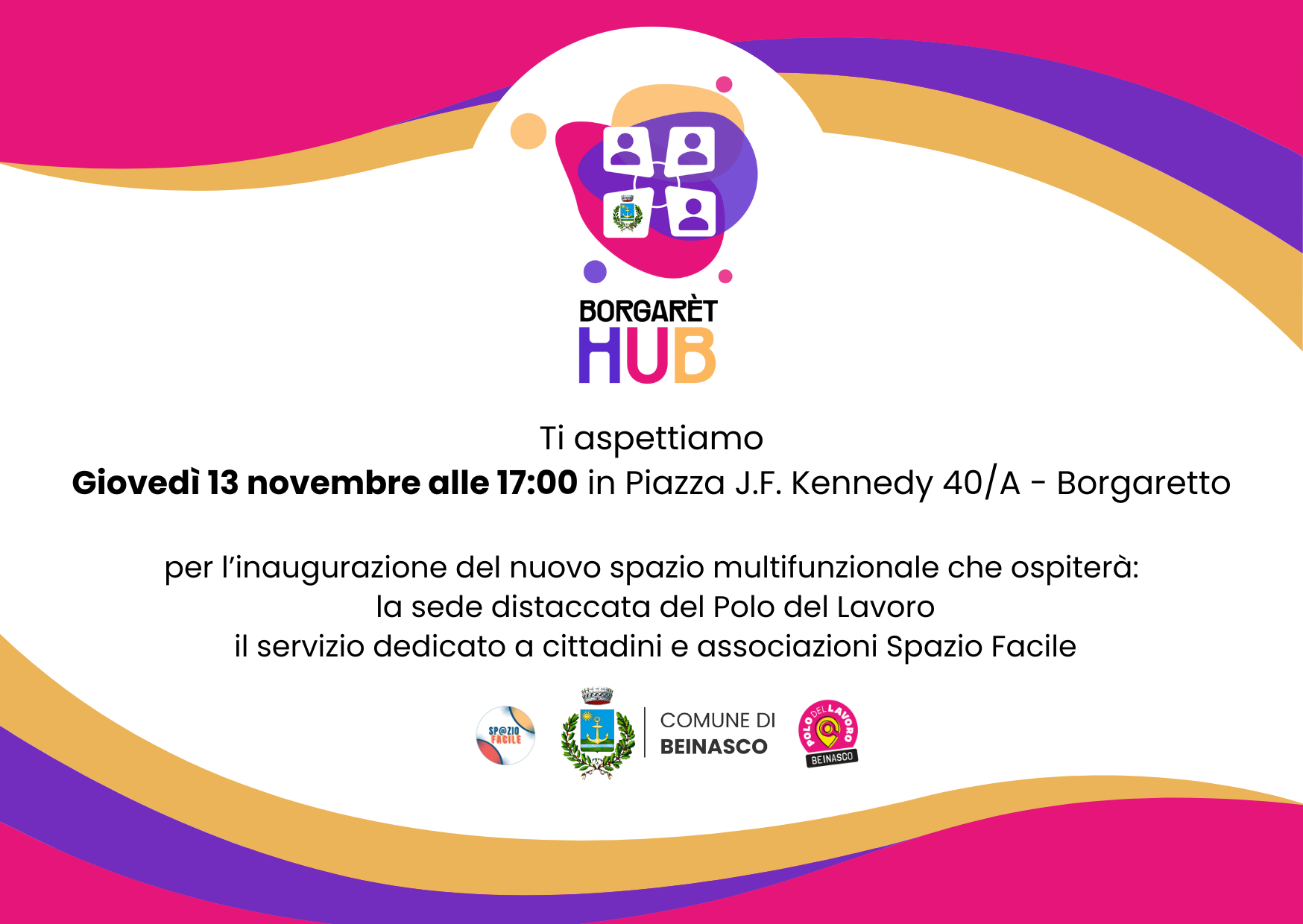 Apre a Borgaretto "Borgaret Hub": uno spazio polifunzionale, situato in Piazza Kennedy 40 a Borgaretto, pensato per offrire servizi utili ai cittadini e alle associazioni.