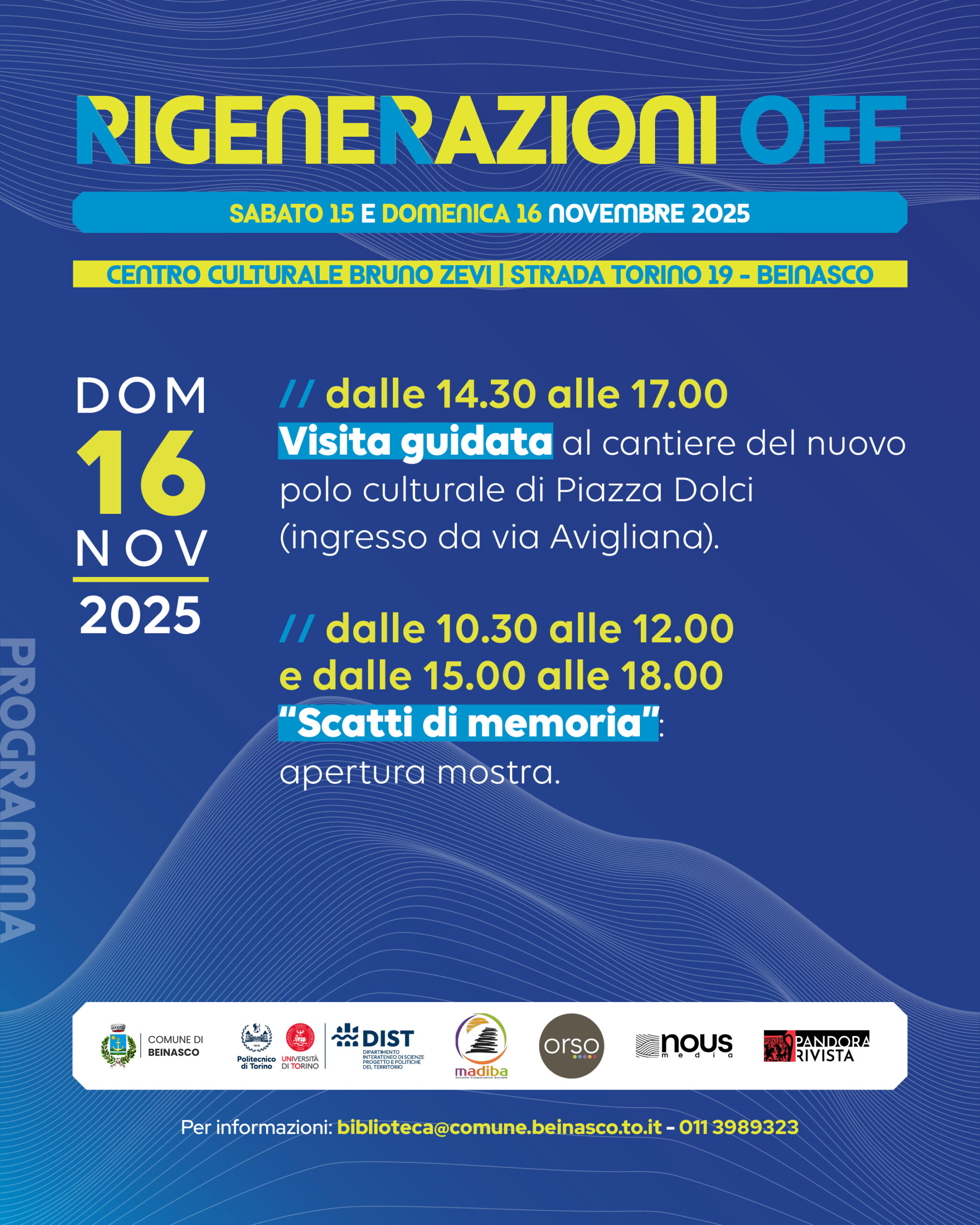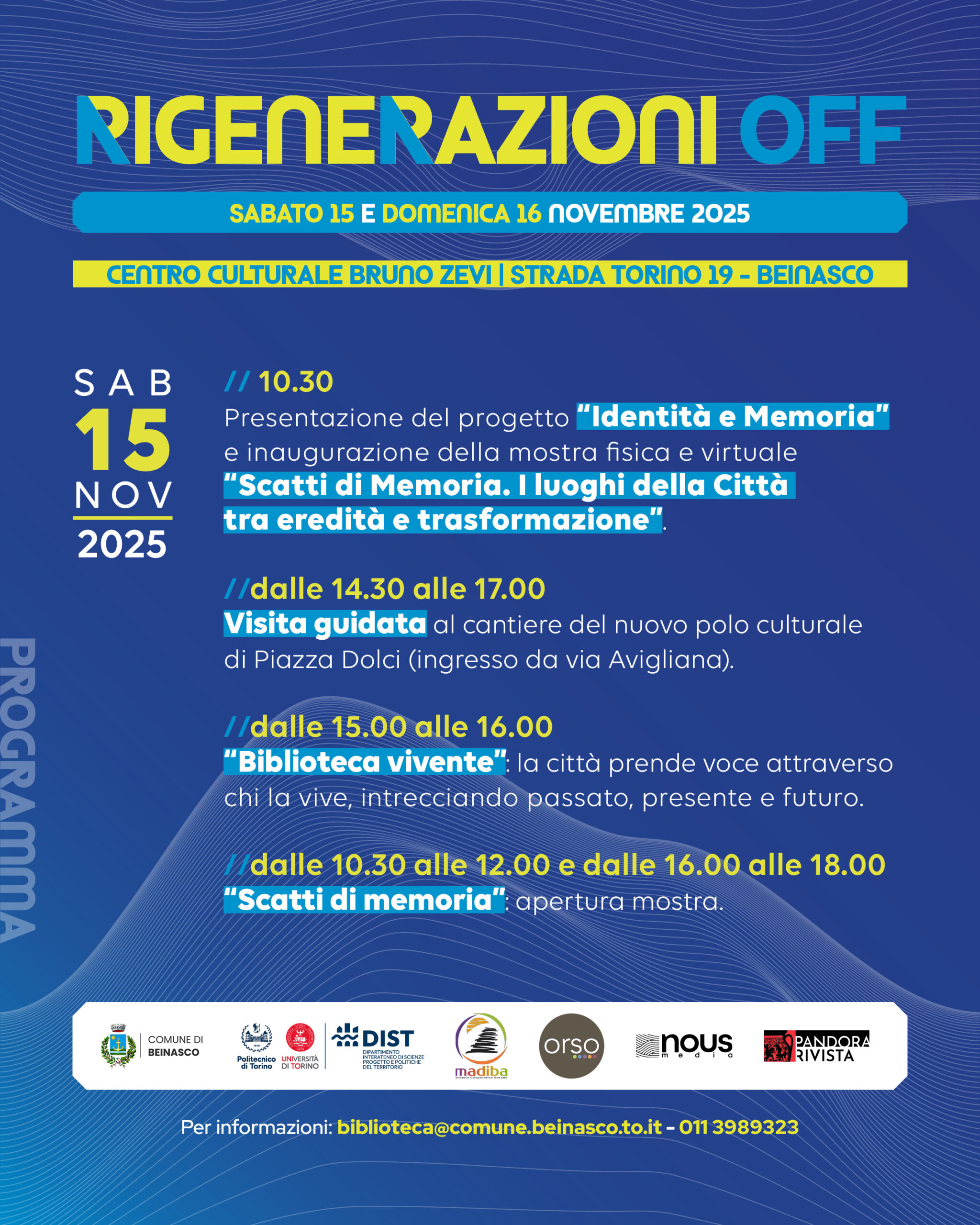 Si parte sabato 15 e domenica 16 novembre con RIGENERAZIONI OFF, tra passato e futuro di Beinasco: al centro Bruno Zevi alle 10:30 inaugurazione mostra fisica e virtuale “Scatti di Memoria. I luoghi della Città tra eredità e trasformazione”, presentazione del progetto “Identità e memoria” a cura del DIST (Dipartimento Interateneo di Scienze, Progetto e Politiche del Territorio) e della “Capsula del Tempo” a cura del CCRR (Consiglio comunale dei ragazzi e delle ragazze)